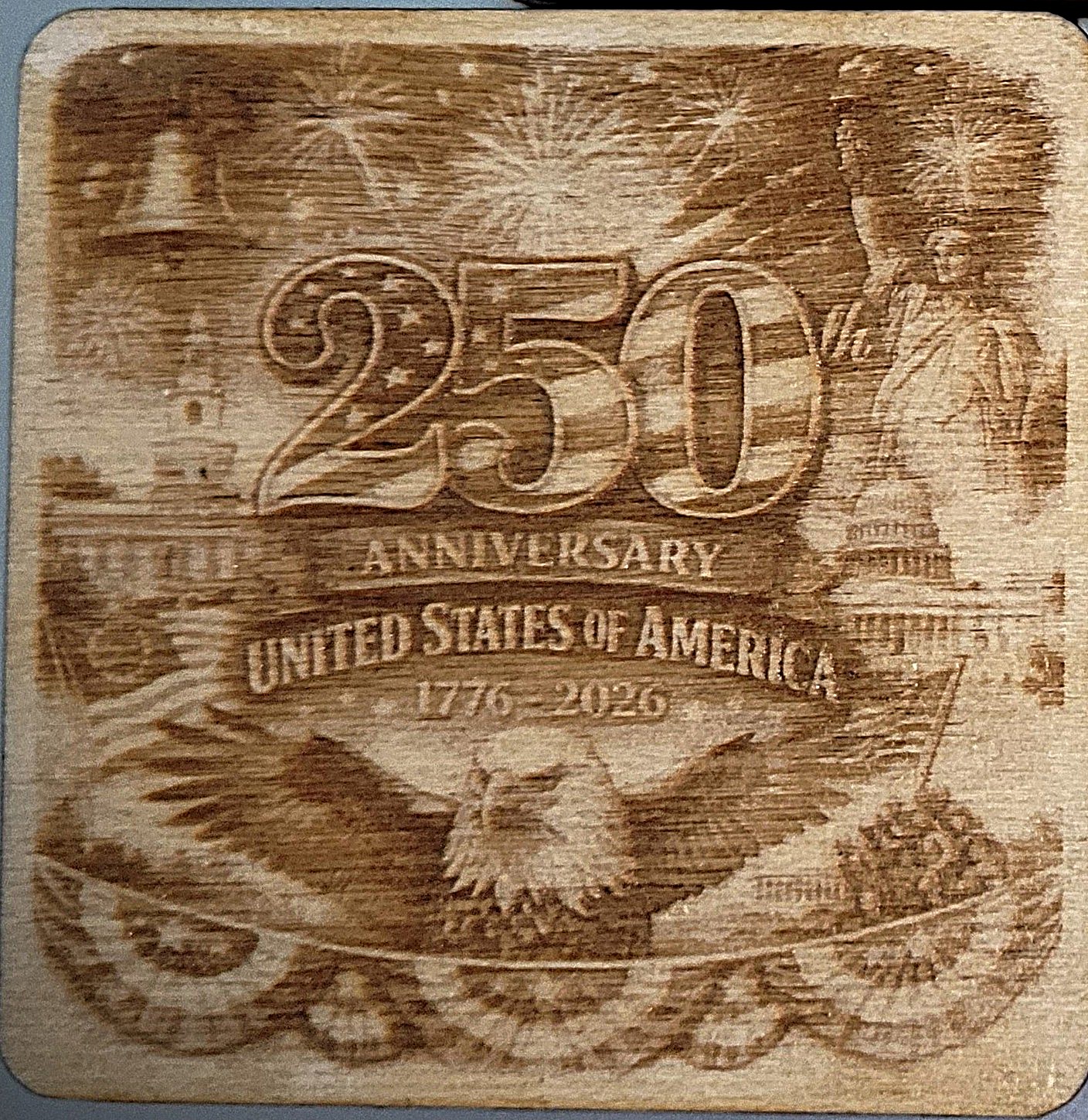 Commemorative 250th Anniversary wooden coasters, measuring 4 inches square by 1/4 inch thick, feature a durable clear coat finish and protective pads to safeguard furniture surfaces.