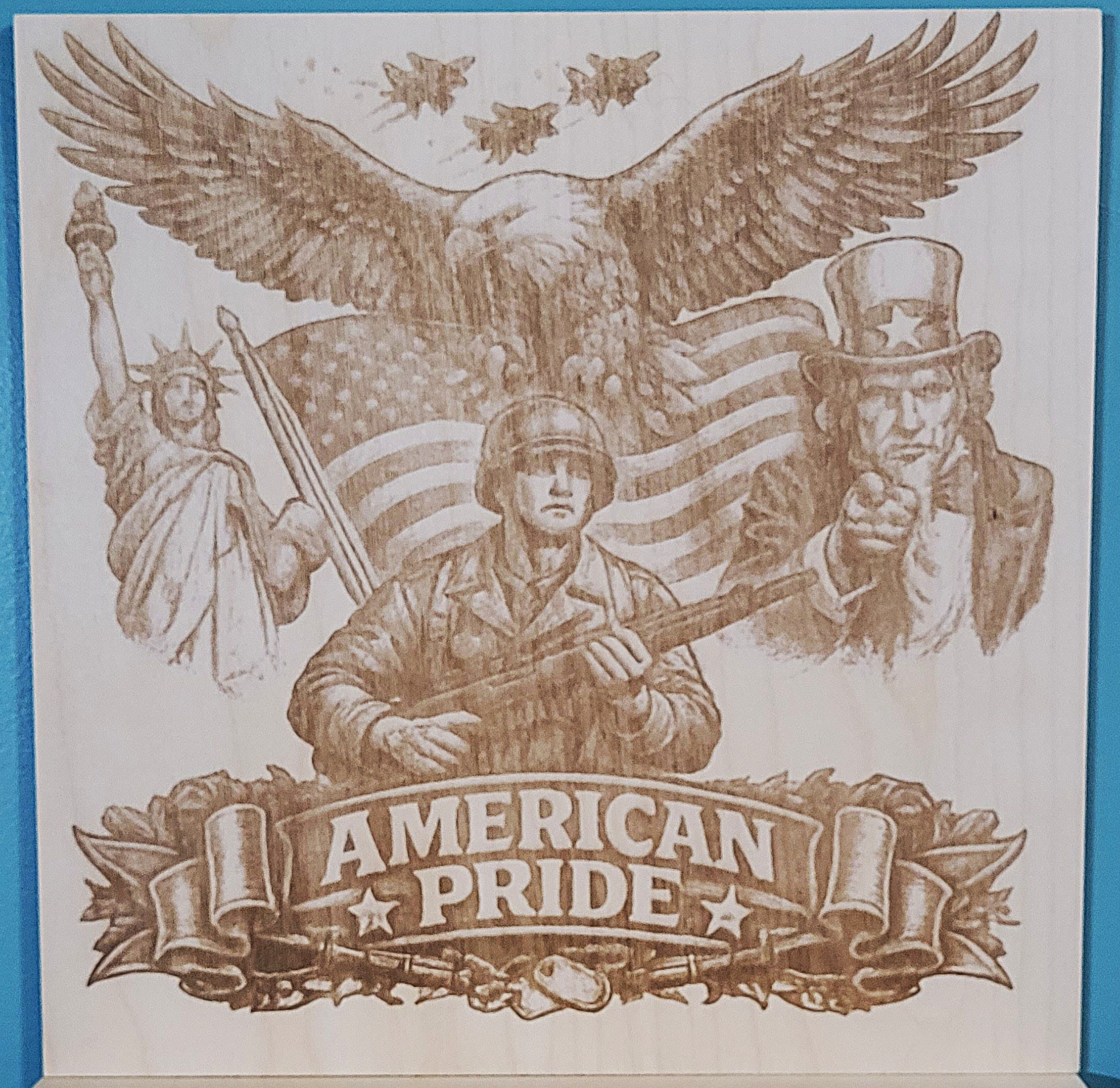 The American Pride Wood Wall Art features precise dimensions of 12 inches by 12 inches with a thickness of 1/4 inch, enhanced by a clear protective coating for durability. It comes fully prepared for convenient and immediate display, ensuring both aesthetic appeal and ease of use.