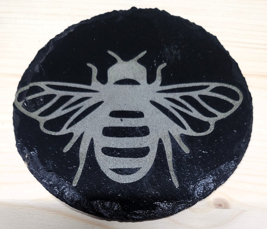 Clear coated Bee Slate Round 4″ Coaster with foam pads to help protect furniture from scratches.