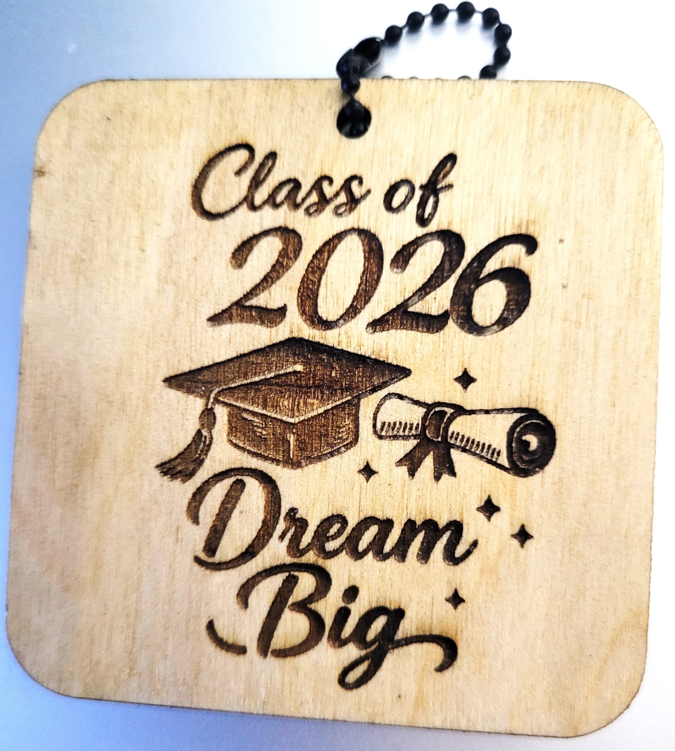 Class of 2026 Wood Keychain – Dream Big. Perfect gift for the Graduate. One-sided keychain, clear coated. This measures 3″ x 3″ x 1/4″ thick.