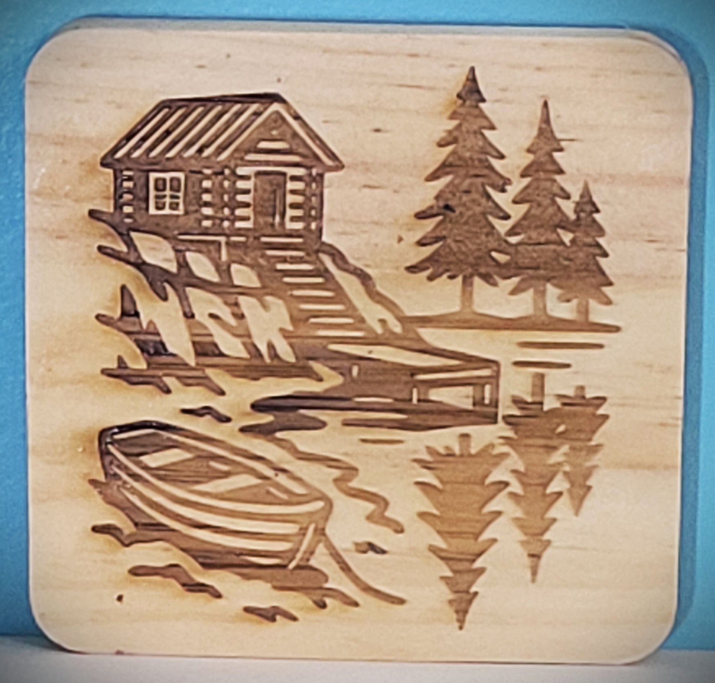 Country Scenic Wood Coaster 4″ Square clear coated with foam pads to help protect furniture from scratches. Perfect for Lakehouse or Cabin.