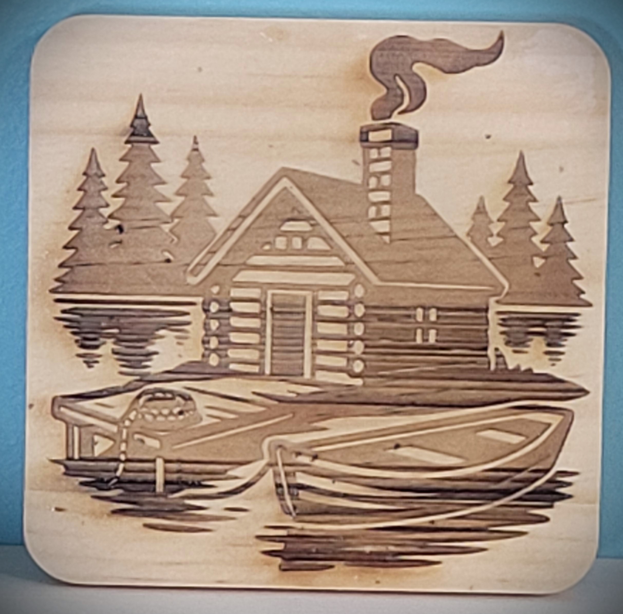 Country Scenic Wood Coaster 4″ Square clear coated with foam pads to help protect furniture from scratches. Perfect for Lakehouse or Cabin.