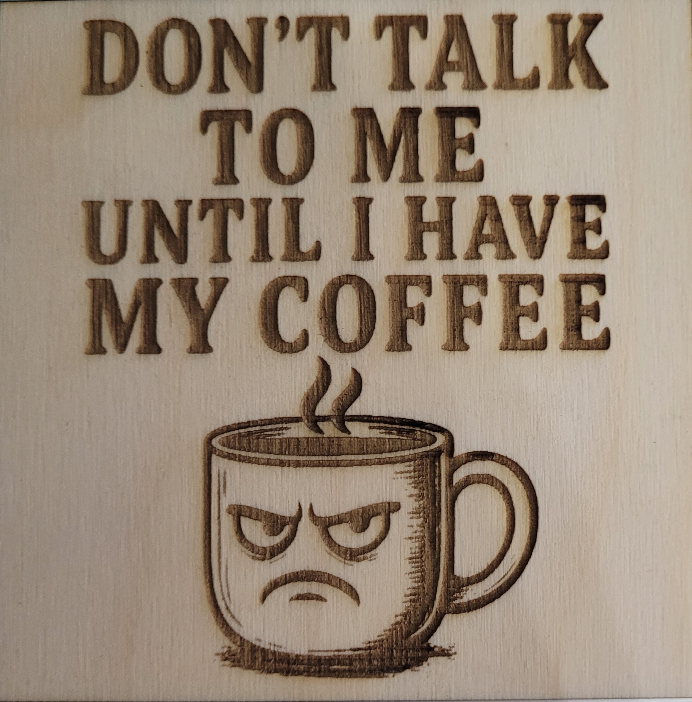 Don’t talk to me Wood Coaster Sq corners 4″ x 1/4″ thick clear coated and pads on bottom to help prevent scratching of furniture.