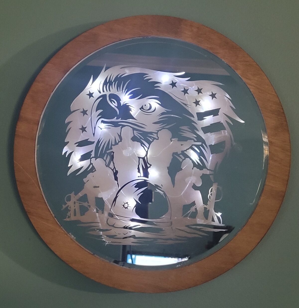 Walnut-Stained Patriotic Eagle/Combat Mirror Lighted 10″ Mirror with White Lights Battery operated