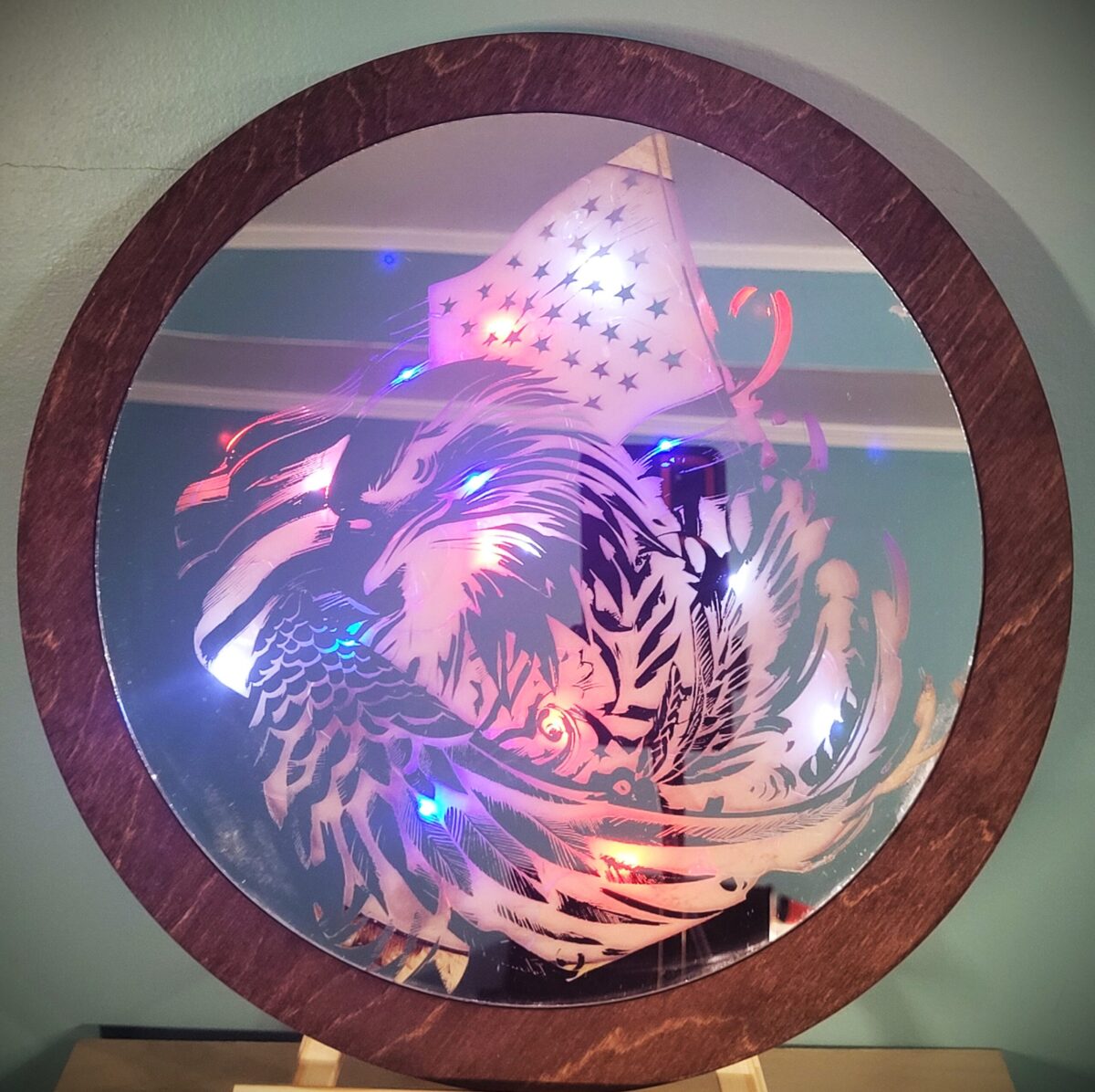 Walnut-stained Patriotic Eagle with Flag Lighted Mirror 10″ Red/White/Blue Lights Battery Powered.