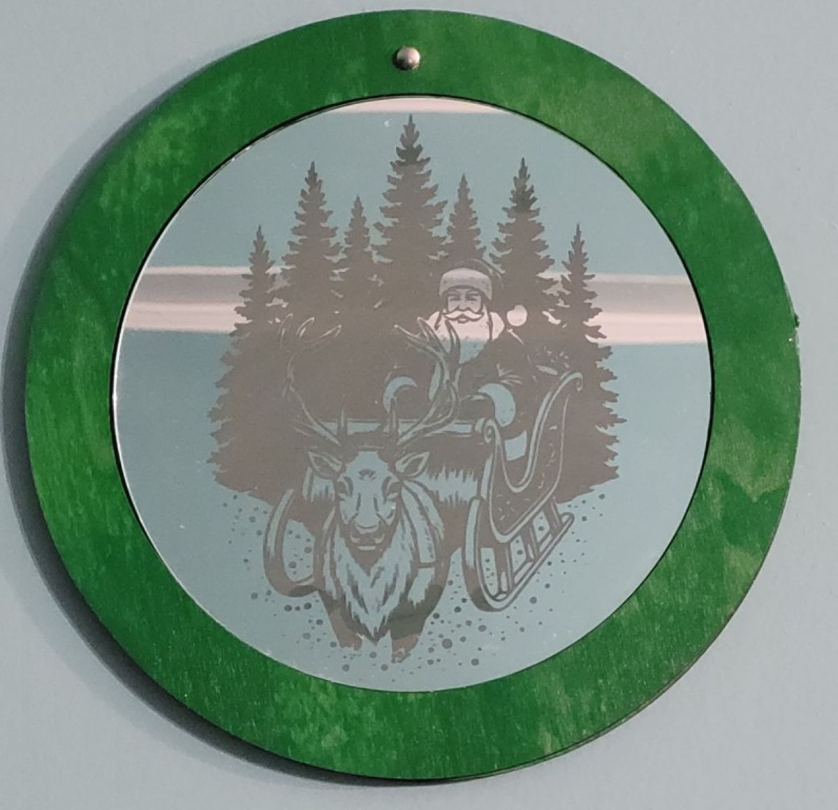Green painted Frame Santa Sleigh 5″ Mirror. Can be used as an ornament or hung on wall.