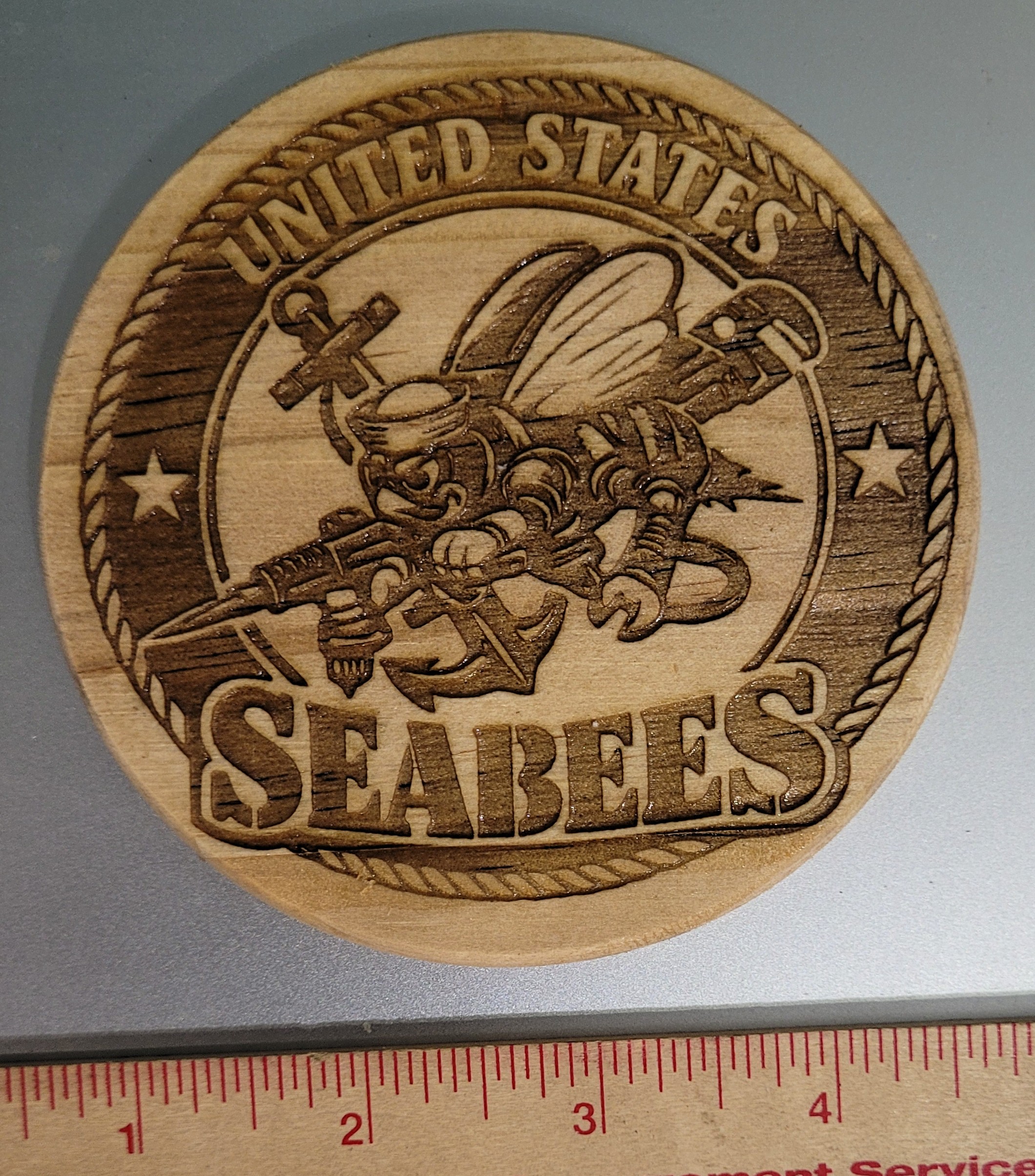 United States Seabees 4-inch round coaster, featuring a durable clear coat finish and equipped with protective pads to safeguard surfaces.
