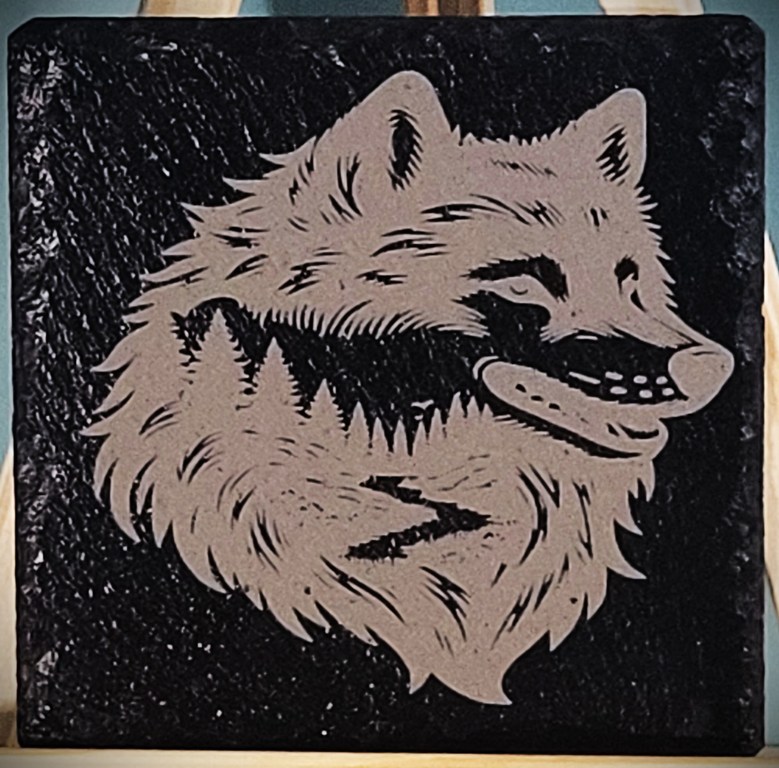 Woodland Wolf 4″ Square Slate Coaster with clear coating and pads to help protect furniture from scratches.